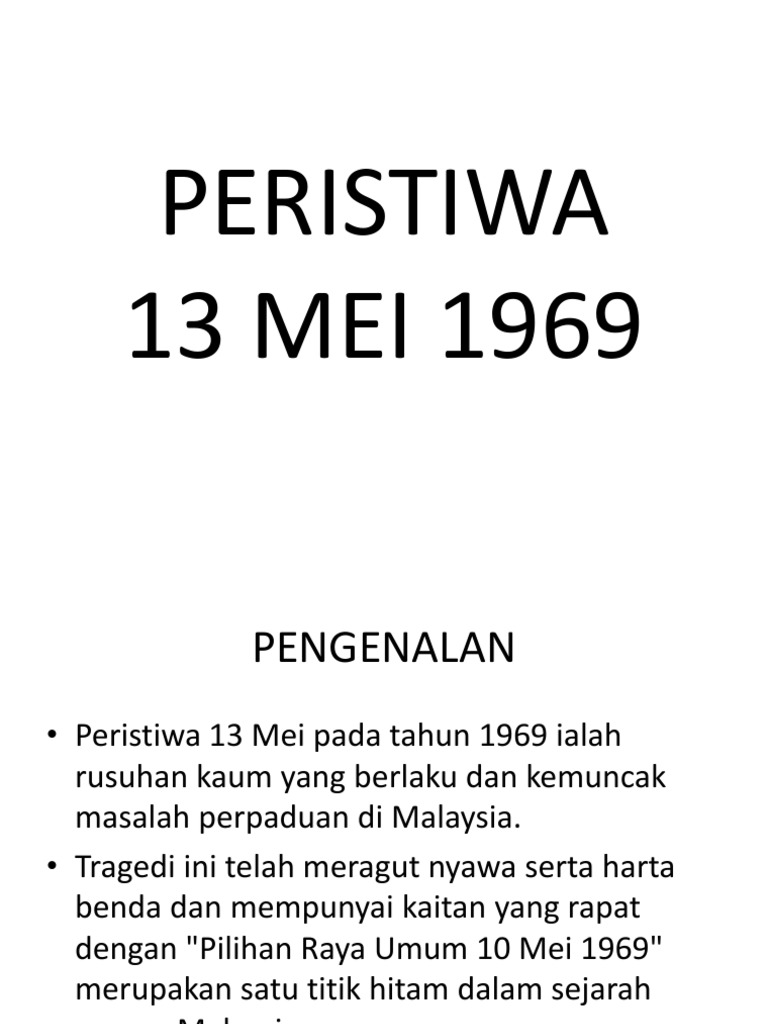 Peristiwa 13 Mei 1969 from online.fliphtml5.com Pengenalan peristiwa 13 mei 1969 merupakan satu tragedi berdarah yang banyak meninggalkan kesan terhadap politik, ekonomi dan sosial masyarakat malaysia. Satu faktor yang turut menyumbang kepada peristiwa 13 me. Peristiwa 13 mei 1969 merupakan satu tragedi berdarah yang banyak meninggalkan kesan terhadap politik, ekonomi dan sosial masyarakat malaysia. Kesan pendudukan jepun di tanah melayu merupakan salah satu faktor yang turut menyumbang kepada peristiwa 13 mei. Jika dilihat faktor berlakunya peristiwa 13 mei 1969 kebanyakan disebabkan oleh peranan penjajah yang telah membentuk satu masyarakat yang mempunyai kelas dan tahap tertentu demi untuk memelihara. Faktor terjadinya peristiwa 13 mei 1969 * dasar pecah dan perintah british pada zaman pemerintahan british. Pada tarikh ini, berlakunya peristiwa berdarah yang tidak akan dapat dilupakan oleh seluruh rakyat malaysia terutama mereka peristiwa ini berlaku berikutan pengumuman keputusan pilihan raya umum(pru) pada 10 mei 1969. Declassified documents on the malaysian riots of 1969.